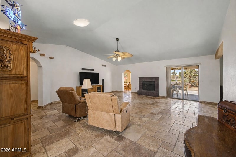 Listing details for 7239 Pueblo Ave, Mesa, AZ 85208 : Character Abounds in this one-of-a-kind home situated on a premium golf course lot at the 13th hole. Huge Bonus NO HOA and RV Garage that's hard to find at this price point! Step inside and fall in love with the character and warmth. This home features expanded travertine floors, vaulted ceilings, skylights, and beautiful wood beam accents that create an inviting, custom feel.The open-concept layout is perfect for everyday living and entertaining. The kitchen offers white cabinetry, travertine countertops, included refrigerator, and a charming breakfast nook, all flowing seamlessly into the spacious great room. Additional living space in the Az. Room, ideal for relaxing year round* The RV garage plus outdoor workshop make this property truly stand out.