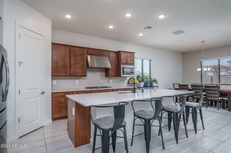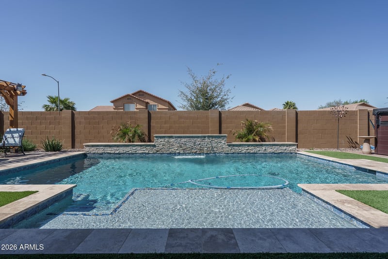 Listing details for 7250 80th Ln, Glendale, AZ 85303 : Located in a gated community near Westgate with easy access to Loop 101 and I-10, this beautifully upgraded home offers 4 bedrooms + den and 3 baths in 2765 SqFt with an open great room layout and split bedrooms. The gourmet kitchen is nicely equipped with 42'' Saddle Brown Birch cabinets, quartz countertops, a 36'' gas cooktop, stainless appliances including double wall ovens, a walk-in pantry, and an island with a breakfast bar. Sliding glass doors from the dining area and the great room lead out to the covered patio which has a ceiling fan and roll-out shades and a fabulous backyard complete with a refreshing pool with stacked stone accents and waterfall and easy-care landscaping with artificial turf and travertine pavers. A travertine patio with gazebo covering provides additional seating out by the pool, and the side yard has a storage shed and a paver walkway leading to the RV gate. The primary bedroom has a deluxe bath with dual dual-sink vanity, tiled shower with glass surround, freestanding soaking tub, and a walk-in closet. Other features include whole home water filtration with 15 year no-maintenance, gutters, a large laundry room with upper/lower cabinets, hanging rod, and sink; a mud room with hooks & cubbies, 12x24 tile floors throughout living areas and baths, upgraded Berber carpeting in bedrooms, spray foam insulation, stone exterior elevation, and a 3-car tandem garage with expanded paver driveway.