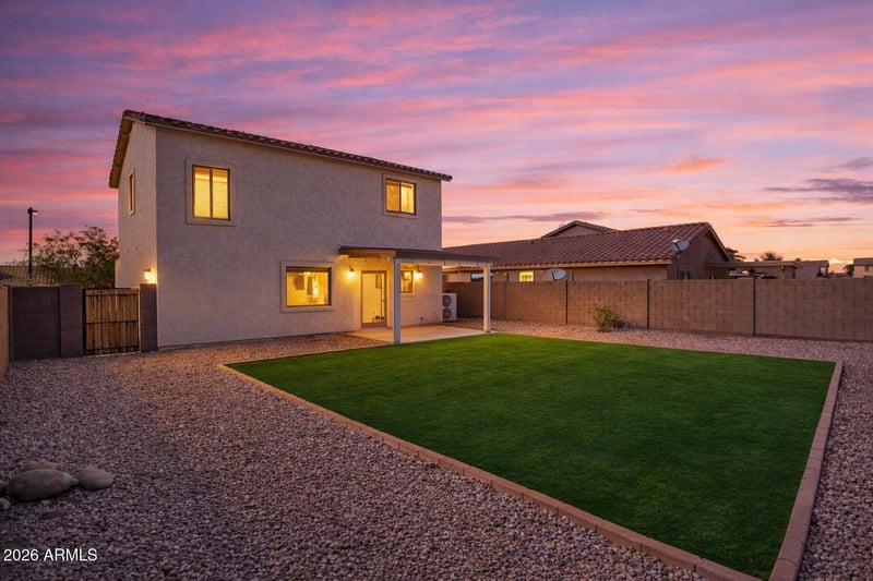 Listing details for 7287 Sunrise Way, Buckeye, AZ 85326 : Welcome to this stunning 4-bedroom, 2.5-bath two-story home in highly sought-after Sunset Point! Enjoy great curb appeal with a 2-car garage, desert landscaping, and a charming front porch. Inside, natural light fills the open layout featuring a formal living room and spacious great room—perfect for entertaining. The modern kitchen offers stainless steel appliances, butcher block counters, black tile backsplash, and a large island. Upstairs, the primary suite includes a walk-in closet and ensuite with separate tub and shower. Relax in the private backyard with covered patio and low-maintenance turf. Move-in ready and waiting for you!