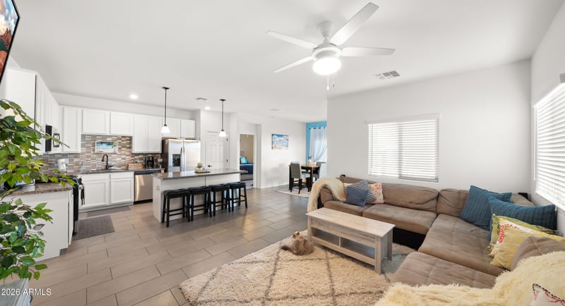 Listing details for 7312 128th Ave, Glendale, AZ 85307 : Conveniently located minutes from Luke Air Force Base, Loop 101, State Farm Stadium, Desert Diamond Arena, and Westgate Entertainment District. Move-in ready. K Hovnanian Bliss Model in Luke Landing, built in 2022. This 3b/2b well-designed floorplan features a spacious great room, split primary room, and open kitchen. Enjoy custom pool with oversized Baja Deck. The premium lot ensures pool privacy with only single-story homes on each side. Garage extended by 2', raised interior height by 1'. Pentair pool pump is Bluetooth-enabled for convenience. This meticulously upgraded home is a must-see today! FHA loan has a 4% int rate could potentially be assumable for qualified buyer