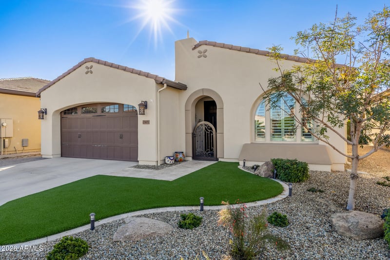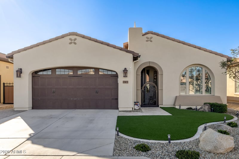 Listing details for 745 Fruit Stand Way, Queen Creek, AZ 85140 : This warm and inviting St. Tropez model is nestled in the prestigious Encanterra® Country Club, offering exceptional resort-style living in the Southeast Valley. This single-story, open-concept home features a neutral palette, wood-look flooring, recessed lighting, and sliding door that blend indoor and outdoor living. The beautifully appointed kitchen showcases quartz countertops, upgraded cabinetry with crown molding, ss appliances, a wine cooler, pantry, and a large island with breakfast bar. The spacious primary suite includes a walk-in closet and private bath with dual quartz vanities. Additional highlights include shutters throughout and a built-in office space. Enjoy relaxing or entertaining in the private, low-maintenance backyard with a covered patio, ramada and cozy fire pit. Encanterra offers premier amenities including pools, dining, championship golf, pickleball, fitness centers, and more. Schedule your private tour today and experience the ultimate Arizona lifestyle.