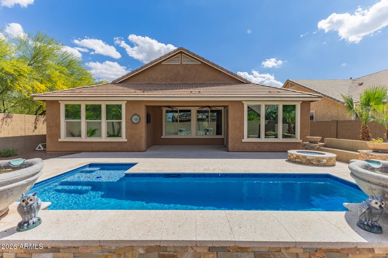 Listing details for 7562 Plata Ave, Mesa, AZ 85212 : Located in the highly sought-after Desert Place at Morrison Ranch, this former model home offers a rare combination of thoughtful design, quality finishes, and access to one of the East Valley's most desirable master-planned communities. The home features a functional split floor plan with separation between the primary suite and secondary bedrooms. Interior finishes include soft, neutral tones, large-format tile in high-traffic areas, granite countertops, elegant stacked cabinetry, and a timeless backsplash. The spacious laundry room, well-maintained garage, RV gate, and additional service door add everyday convenience. The backyard is designed for low-maintenance enjoyment, highlighted by a heated pool ideal for year-round use. As an added opportunity, the sellers are willing to incl e all personal property, creating a true turnkey option. Desert Place at Morrison Ranch is known for its tree-lined streets, signature white fencing, and extensive greenbelt system. Just a short walk away is a large, shaded park with over an acre of play areas, along with miles of walking and biking paths that support an active outdoor lifestyle. Conveniently located near shopping, dining, and major freeway access, this home offers both lifestyle and location in one of Mesa/Gilbert's premier communities.