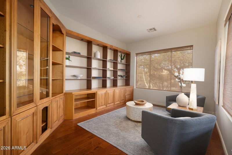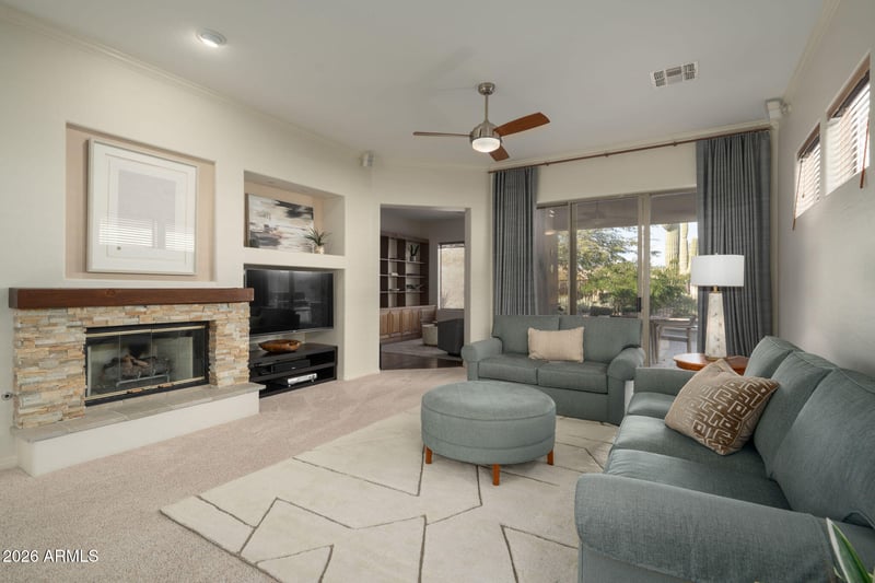 Listing details for 7616 Corva Dr, Scottsdale, AZ 85266 : Welcome to this beautifully maintained 2-bedroom, 2-bathroom home with a versatile bonus room, perfectly situated in the prestigious guard-gated community of Bellasera. With over 1,800 sq ft of living space, this warm and inviting residence blends comfort and quality throughout, offering an ideal setting for relaxed Scottsdale living. The spacious eat-in kitchen features stainless steel appliances, generous counter and cabinet space, large pantry, and a comfortable dining area—perfect for casual meals or entertaining friends. The open layout connects effortlessly to the bright living spaces and the serene backyard, which is nicely landscaped and accented with pavers and a built-in gas fire pit—an inviting spot to enjoy Arizona's beautiful evenings. The primary suite provides a peaceful retreat with an ensuite bath featuring dual vanities and a spacious walk-in closet. The spacious secondary bedroom is perfectly sized for guests and includes a large walk-in closet. The bonus room is currently configured as an office with custom built-ins, offering convenience and flexibility to suit your lifestyle. Bellasera residents enjoy resort-style amenities including a clubhouse, fitness center, community pool, pickleball and tennis courts, dog park, and miles of scenic walking trailsall within the security of a guard-gated neighborhood. This lovely home offers a comfortable, move-in-ready lifestyle in one of Scottsdale's most desirable communities. Thoughtfully cared for and tastefully presented, it provides the perfect blend of practicality and charm. Schedule your private showing today and experience everything Bellasera has to offer.