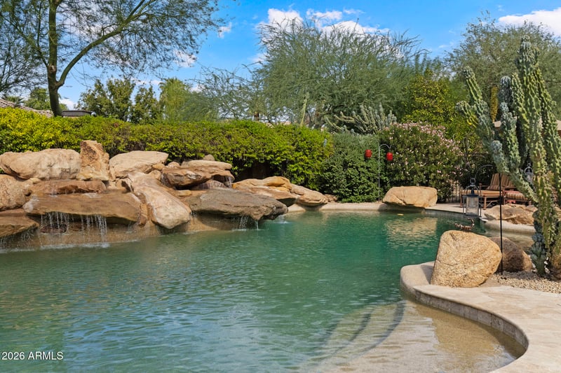 Listing details for 7640 Poinsettia Dr, Scottsdale, AZ 85260 : A rare estate in the heart of Cactus Corridor—Portales del Sol is an intimate gated enclave of just ten residences offering privacy, lush mature landscaping and a hidden setting that feels worlds away. This 6,295 SQFT custom home plus 645 SQFT detached guest house feature six ensuite bedrooms, eight bathrooms and multiple private wings for exceptional flexibility, all on a 35,116 SQFT lot. With a brand-new roof and full original architectural plans conveying, the property presents a compelling entry into a gated enclave where surrounding new construction continues to redefine price expectations. Resort-style grounds showcase a tropical diving pool, heated spa, covered portico with built-in BBQ and fireplace, manicured lawn and mature palm and citrus trees. A four car garage and advanced security system complete this exceptional offering. ENTRANCE into the community is through a gated, tree-lined drive that leads into a lush cul-de-sac of custom estates. Mediterranean-Southwestern architecture blends beautifully with European-inspired elegance, where a fountain and bougainvillea-wrapped columns frame the custom mullion-glass front door. The dramatic entry rotunda, finished with a copper-inlay, sets the tone for the refined craftsmanship found throughout the home. EAST WING serves as a private retreat anchored by the grand primary suite with fireplace, sitting area, and French doors opening directly to the gardens and pool. Dual walk-in closets and a luxurious spa-style bath with dual vanities, soaking tub, and walk-in shower create an indulgent setting. This wing also includes a richly finished private office, a dedicated exercise room, and an additional ensuite bedroom ideal for guests, extended family or snoring spouse. WEST WING offers three oversized ensuite bedrooms, each with walk-in closets, private baths, built-in shelving, and charming window seats. The bedrooms surround a spacious game room that can be fully closed off for privacy and includes two built-in desks with task lighting and a dedicated exit leading to the pool and patio. CHEF'S KITCHEN sits at the heart of the home and showcases dual granite islands, Sub-Zero and DACOR appliances, dual stoves, dual warming drawers, dual dishwashers, dual pantries, and a custom hand-crafted copper hood. Just beyond the kitchen door, a private patio overlooks a lush garden and waterfallan ideal setting for morning coffee or an early afternoon cocktail, embracing the seamless indoor-outdoor lifestyle Scottsdale is known for. FORMAL ENTERTAINING spaces include an elevated rotunda dining area with a custom mesquite table for 8 to 12 guests, an adjacent 900-bottle wine room, a private living room with fireplace perfect for a grand piano or post dinner cocktail, and a beautifully designed custom bar featuring a hammered copper sink,an elegant focal point for hosting larger events. The scale, materials, and flow of these spaces create an elevated environment for entertaining of any size. OUTDOOR LIVING evokes the feeling of a private resort, with deep covered patios providing shade throughout the day. The tropical pool features a rock waterfall, diving rock, extended Baja shelf, and heated spa. Expansive real-grass areas, mature citrus trees, and stately palms create a lush oasis rarely replicated in new construction. The covered entertainment portico with built-in BBQ and fireplace is perfect for alfresco dining. With no neighbors on three sides, this property offers exceptional privacy, while double-gated side yards provide discreet areas for pets, storage, or outdoor projects. GUEST HOUSE features its own private entrance and includes a bedroom, bathroom, living room, kitchenette, and laundry hookups, making it ideal for visiting family, long-term guests, live-in staff, or multigenerational living. UPGRADED FEATURES include CAT5 wiring, EERO WiFi mesh, Golden Eagle security, WiFi-enabled garage openers, Spotify-connected surround sound inside and out, and a custom iron pool safety fence. Recently painted inside and out, with new carpet and fully serviced systems, this estate has been impeccably maintained and is being offered for the first time. A rare opportunity to own a private, architecturally distinctive Scottsdale luxury home close to major medical centers, the 101 freeway, Scottsdale's top dining and shopping, private and commercial air travel, and highly rated schools.