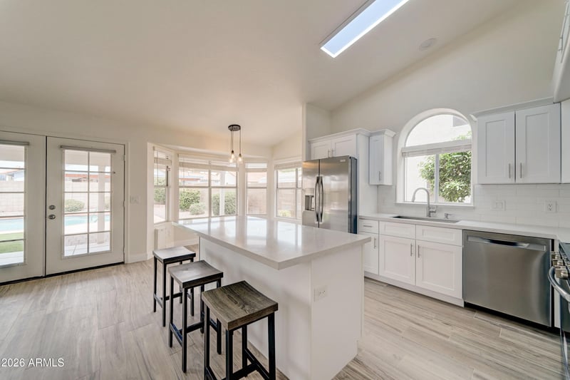 Listing details for 7664 Redfield Rd, Peoria, AZ 85381 : WELCOME HOME! Come see this Beautifully Updated & Remodeled property! Step Inside To Soaring Vaulted Ceilings, New Rich WOOD-LOOK Tile Plank Flooring, New Kitchen with Gorgeous Custom Cabinetry, Big Island with the Natural Beauty of Quartz Countertops, New Gallery Stainless Steel Appliances, Stainless Steel Farm Sink with pull out Faucet, Pantry, Eat-In Kitchen, Cool ''SKY LIGHT'' with 3 Settings(turn the switch on / off to see your favorite!). Open Great Room has an Abundance of Windows for Wonderful Natural Lighting! Nice sized Master Suite with Dual Sink Quartz Vanity, Soaking Tub, Modern Look Polished Ceramic Tiled Shower Dressed in Brushed Nickel, Framed Mirrors & Walk -In Closet. New Guest Bath with Polished Ceramic Tiled Shower & Tub and New Farm-House Vanity with Framed Mirror. Awesome Beachy Backyard with just Newly Replastered Pebble Sheen Sparkling Blue Swimming Pool! Synthetic Green Grass Area for easy Maintenance, Big Covered Patio for those Hot Summer Days! Fresh Two-Tone Exterior Paint, New Neutral Compfy Carpet, New 4" Custom Baseboards, Newer Trane AC Unit, New Window Blinds, All New Ceiling Fans, New Brushed Nickel Door Hardware, New Toilets, New Outdoor Coach Lights! Good Sized 2.5 Car Garage with built In Cabs! Come out and see this GEM of a Home Today! ENJOY:)