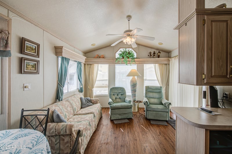 Listing details for 7750 Broadway Rd #202, Mesa, AZ 85208 : Beautifully maintained West facing home in Carriage Manor Resort, a premier 55+ Community where you OWN THE LAND! Outside you have a very nice custom Trex deck, roof shingled in 2018 and under the house you have all PEX plumbing. Inside you'll find gorgeous laminated floors. Sleeper sofa in front living room and 2 sleeper sofas in the large Arizona room. Carriage Manor has 24/7 on site security, a heated SALTWATER pool/spa, fitness facility, Tennis, Pickleball, Bocce, Shuffleboard, Golf Club, Billiards, Lapidary/Silversmith, Ceramics, Glass Art, Sewing, Wood shop, Bingo, Dances parties & many more activities & amenities