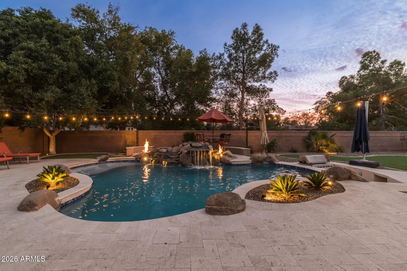 Listing details for 801 Macaw Dr, Chandler, AZ 85286 : Designed for elevated living and effortless entertaining, this exceptional basement home offers luxury, privacy, and major upgrades including a new roof and new A/C in 2026. Inside, tall ceilings and open living spaces create a bright, spacious feel. The family room features a gas fireplace, built-in media cabinet, and large windows that fill the space with natural light. The chef's kitchen offers upgraded appliances, a 6-burner gas cooktop, granite countertops, a large island, ample cabinetry, a built-in refrigerator, and a built-in warming drawer. The primary suite offers a private retreat, complemented by additional bedrooms and flexible spaces. The finished basement features beamed ceilings, a large living area, two bedrooms, a full bath, and a kitchenette, ideal for guests or multigenerational living. Step outside to a true resort-style backyard with a serene pool featuring water and fire features! Enjoy a sunken built-in grill, mature landscaping, and artificial turf, luxury outdoor living at its finest. The pool has updates including PebbleTec finish, decking, tile, and a pool heater. A three-car garage, double RV gate, and no neighbors behind complete this stunning home!