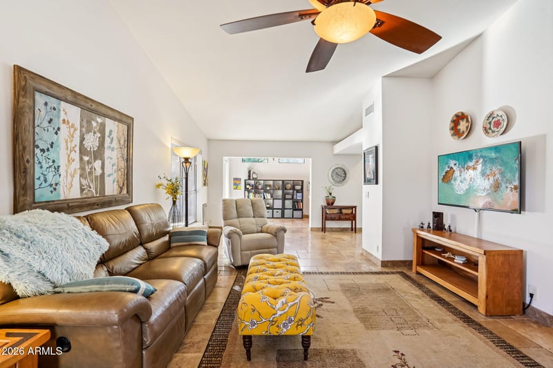 Listing details for 8019 Mclellan Blvd, Scottsdale, AZ 85250 : Is there a 3-bed home in Scottsdale under $750K with a pool and no HOA? Yes, and it's tucked away in a beautifully maintained neighborhood near Chaparral Park and the Greenbelt. This 3 bed, 2 bath, 1,600 sq ft home at 8019 E. McLellan Blvd offers tastefully remodeled living with timeless upgrades and real walkability. Inside, you'll find travertine flooring throughout with newer carpet in the bedrooms, slab granite kitchen counters, alder wood cabinetry, and tumbled stone accents. The split master suite features a limestone vanity, and added storage. The great room flows to a formal dining space and eat-in kitchen, all under vaulted ceilings with upgraded ceiling fans. Both bathrooms have been updated, and all kitchen and bath fixtures have been replaced. Additional upgrades include a newer HVAC system, water softener, and included appliances (refrigerator, washer, dryer). Outside, enjoy your private pool, 2-car garage, and a lot with no HOA dues. Walk to Pueblo Elementary, Saguaro High, Chaparral Park, and the Arizona Canal path. Just minutes from Old Town Scottsdale and Fashion Square shopping. Move-in ready and well cared for since its 2008 remodel, this home offers comfort, value, and location.