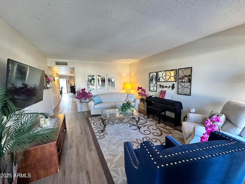 This light and bright condo features a welcoming front living room with a north-facing window and security door, flowing into an open family room and updated kitchen. The kitchen offers a center island, modern finishes, cabinetry with pull-outs, and all appliances convey. The spacious primary suite is located at the back of the unit and includes a walk-in closet and a beautifully remodeled bathroom with a raised vanity, dual sinks, and a gorgeous, tiled shower. The guest bedroom is conveniently located across from the guest bathroom with a tub/shower combinationideal for visitor privacy. Step into the sunny Arizona room overlooking green space, perfect for use as an extra sleeping area, home office, or bright craft/sewing room. The condo's location provides added privacy with no neighboring unit directly behind.