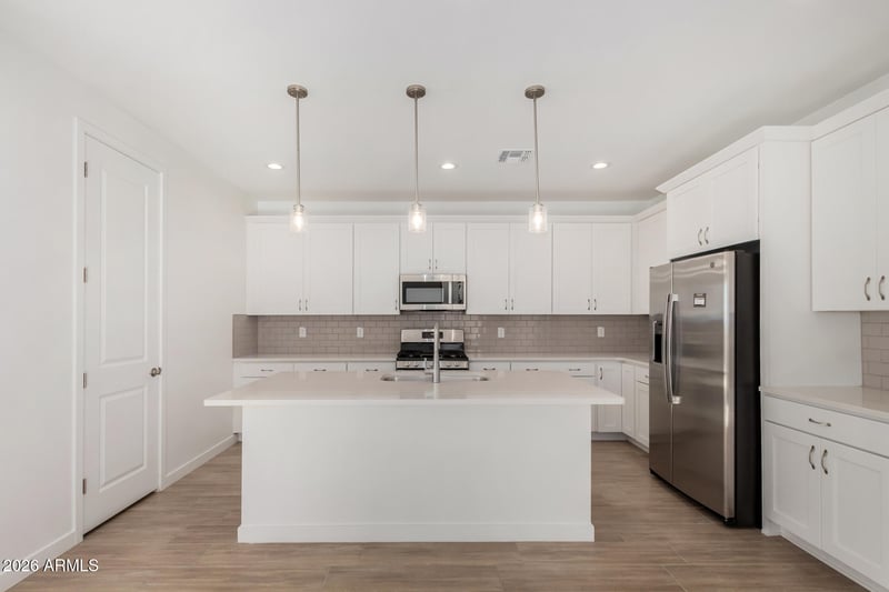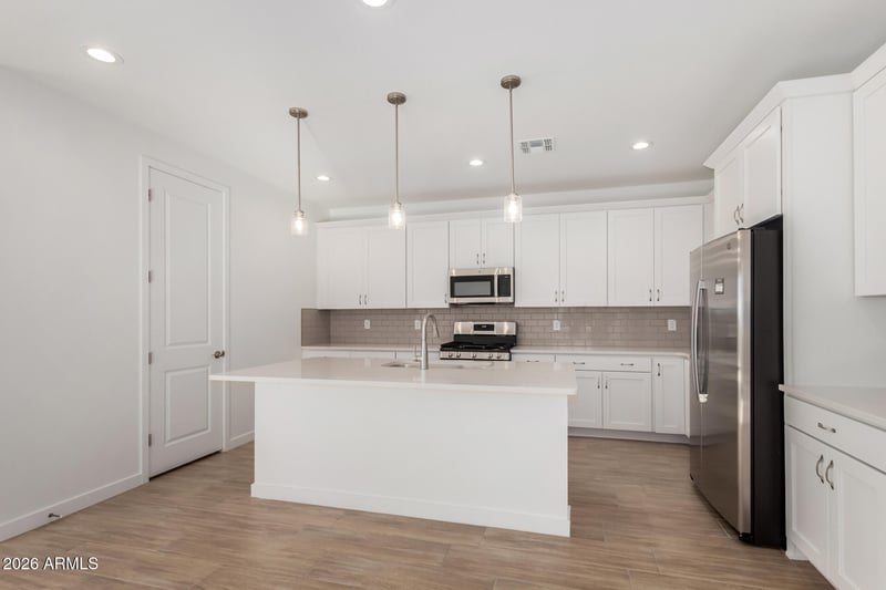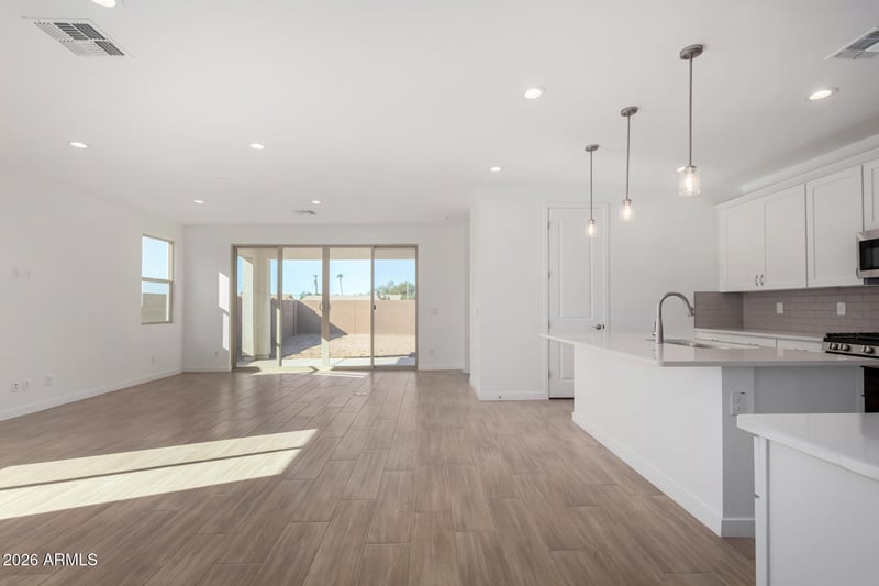 Listing details for 8046 54th Ln, Glendale, AZ 85302 : Explore this thoughtfully designed Slate floorplan, ready for quick move-in on a homesite boasting front yard landscaping and driveway/walkway pavers. Included features: an inviting covered, paver entry; a well-appointed kitchen offering 42'' shaker cabinets, quartz countertops, stainless-steel appliance suite, a center island with pendant lights, and a spacious walk-in pantry; an expansive great room with adjacent dining room; a lavish primary suite showcasing a generous walk-in closet and a private owner's bath with separate soaking tub and tile shower, and dual sinks with cultured marble countertops; a convenient central laundry room; a guest bedroom featuring en-suite bathroom with step in shower. You'll also find a spacious covered patio, and a 2-car garage with 8' door and belt drive opener, as well as a garage service door. Find other desirable finishes, like 9x35" tile in the main living areas (carpet in bedrooms only), a convenient soft water loop in the garage, gas tankless hot water heater, and a gas stub at the patio. This home also offers ceiling fan prewire in all bedrooms, great room, and patio, plus much more!