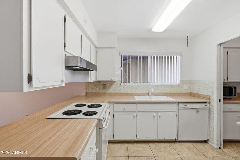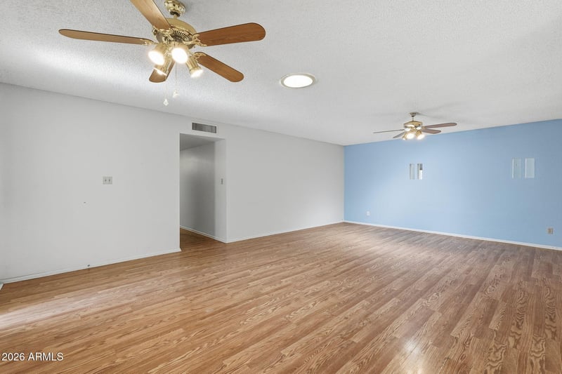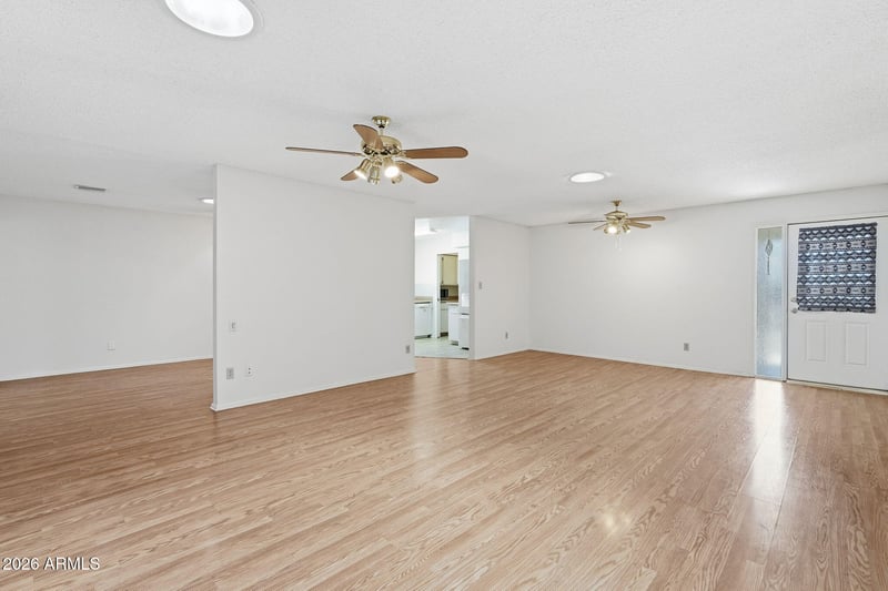 Listing details for 8126 Dahlia Dr, Mesa, AZ 85208 : Cul-de-sac lot in the 55+ Fountain of the Sun community! A generous formal living & dining space with ceiling fans & wood-look flooring leads into a well-sized kitchen with a window over the sink & attached pantry/laundry room. The breakfast area connects to a large family room with sliding door access to the Arizona room. The primary suite includes French doors, walk-in closet, direct Arizona room access & an ensuite with separate make-up vanity & walk-in bathtub. The secondary bedroom & full bath with shower/tub combo offer comfortable guest space. Enjoy a screened-in Arizona room, desert landscaping & concrete panel fencing. The community features golf, ponds & fountains, rec center, shuffleboard, pickleball, pool & spa, plus quick access to Loop 202, US-60, shopping & dining.