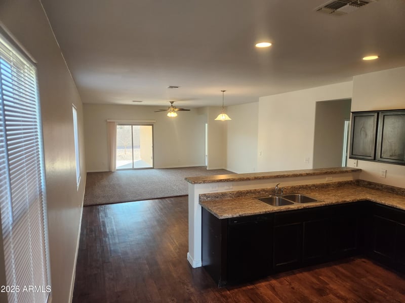 Listing details for 8141 Encinas Ln, Phoenix, AZ 85043 : Charming Tuscano single-level home offering 3 bedrooms, 2 bathrooms, and spacious great room--perfect for working from home. Beautifully maintained, this 1,830 sq ft property features a large open floor plan with abundant natural light. Stylish wood-like flooring flows seamlessly into plush like-new carpeting in the living room and bedrooms. The kitchen boasts rich espresso cabinetry, upgraded granite countertops, beautifully coordinated appliances, ample counter seating, and a generous pantry. The spacious backyard offers low-maintenance desert landscaping, a covered patio for relaxing, and a convenient storage unit for tools or toys. Ideally located near Loop 202, providing stunning mountain stunning mountain views while offering quick and easy access to the I-10 and the entire The Tuscano community features greenbelts, parks, and playgrounds--creating an ideal place to call home. Perfect for primary residence or as an investment property. Act quickly--this one won't last!!