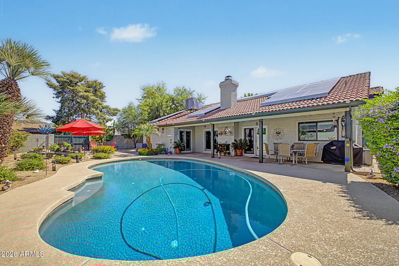 Listing details for 816 Grandview Rd, Phoenix, AZ 85022 : Become the proud owner of this fantastic 4-bedroom, 2-bath residence! You're greeted by a 2-car garage, an extended driveway, a charming desert landscape, and an inviting front patio perfect for morning coffee. Discover a captivating living room with vaulted ceilings, recessed lighting, a soothing palette, attractive wood-look flooring, and a cozy fireplace for relaxing evenings with loved ones. The gourmet kitchen features a breakfast nook, granite counters, a stone-tile backsplash, and stainless steel appliances for a delightful cooking experience. The primary bedroom showcases a sitting nook, French doors that lead to the backyard for a seamless indoor-outdoor flow, classic plantation shutters, an ensuite with double sinks, and a walk-in closet. Imagine peaceful afternoons in the lovely backyard, which offers a covered patio, stylish pavers, and a sparkling pool for cooling down on hot summer days. Make this incredible gem yours now!