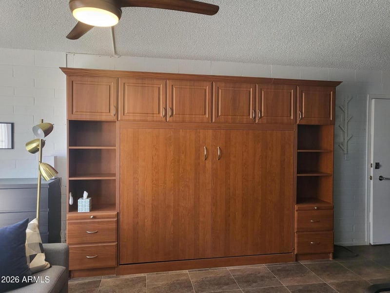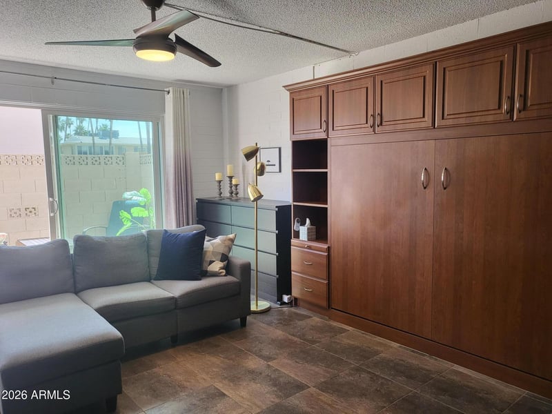 Listing details for 8210 Garfield St #K116, Scottsdale, AZ 85257 : Gorgeous, Move-in ready, fully remodeled & furnished ground floor studio! Incredible kitchen: Quartz counters, pantry, double sinks, soft close/pull out cabinets, high end appliances: Induction Range, Microwave is convention oven & air fryer too, European refrigerator & Deluxe exhaust fan. Double pull out Murphy Bed with storage, 20'' tile throughout, Dual Pane window & slider door to private furnished patio. Close to pool, mail & parking. Coop is cash only, fast & easy board & credit approval done. No rentals, assisted/comfort animals only. $349 monthly covers: taxes, blanket insur, water, full repair of roofs, a/c & heating units, water heater, electrical & plumbing in walls, 4 pools, 4 laundry, exercise, library & meeting rooms. Near freeways, parks & shopping, bus stop & Free Trolley!