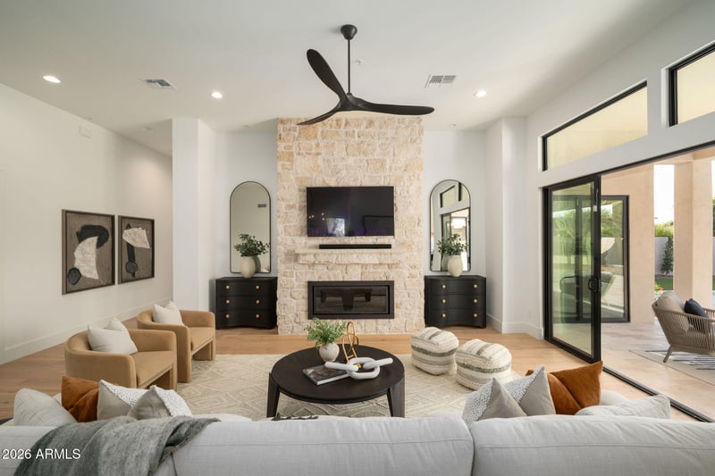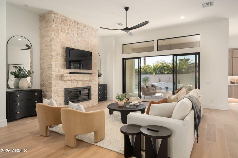 Listing details for 8281 Buteo Dr, Scottsdale, AZ 85255 : Welcome to Grayhawk! This 24/7 guard gated community is one of Scottsdale's most sought after neighborhoods offering privacy and security. This fully remodeled home features a sophisticated blend of French country charm and modern desert living. Situated on a corner lot, from the moment you walk in you are greeted by engineered wood floors and 12 foot ceilings. The heart of the home is the stunning floor-to-ceiling natural limestone fireplace, a timeless focal point that anchors the spacious living room with its organic elegance and warmth. Flanking this architectural centerpiece are two expansive 8-foot sliding doors that effortlessly disappear, seamlessly blending indoor comfort with the beautifully reimagined backyard creating an inviting indoor-outdoor flow. Perfect for effortless entertaining, relaxing evenings, or simply soaking in the natural light and fresh air. Step outside to a brand new resort-style pool framed in custom checkered tile with a wonderful built in stoned grill and built-in firepit  perfect for relaxing and entertaining friends and family. Every inch of this home from the layout redesign, engineered wood floor , custom cabinetry, smoothed out drywall and new backyard, has been thoughtfully curated to deliver the feel of true elegance. Capturing the feel of a new build. The open-concept kitchen anchors the home featuring a 48" Monogram double oven gas range, matching refrigerator, and a hidden butler's pantry. The primary suite offers a spacious luxury bathroom with spa-level finishes and thoughtful lighting, designed to feel calm and restorative. On the other side of the home we have a 2 more bedrooms, a powder room and full bathroom offering their own unique style to the home. Making the flow and functionality of the home consistent throughout. Grayhawk has a wonderful country glub, nearby shopping and easy access to the freeway. Lastly, a neighborhood favorite within walking distance, Isabella's Kitchen.