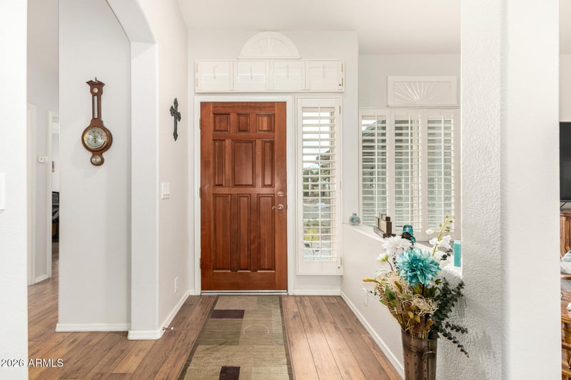 Listing details for 8302 Marco Polo Rd, Peoria, AZ 85382 : Incredibly well-cared-for 2 bedroom home plus a den and a bright, open layout. Vaulted ceilings, plantation shutters, and wood-look flooring give the main living areas a warm, homey feel. The kitchen opens to the dining space and features stainless steel appliances, a gas range, and a breakfast bar, plus updated countertops and fixtures. Double doors lead to a flexible den that works great as a home office, hobby room, or quiet retreat. The primary suite is spacious with a large bay window, a private exit to the back patio and includes an updated bath with dual sinks and a walk-in shower. Outside, enjoy easy-care desert landscaping and a backyard designed for relaxing and entertaining, with a covered patio plus an Alumawood lattice patio cover, paver sitting area, and raised planters with retaining walls. Major updates include a newer roof (2016), replaced HVAC (2018), energy-efficient Simonton Daylight Max windows (2025), and a Rheem water heater (2025). Garage improvements include added storage cabinetry, plus a newer garage door and opener.