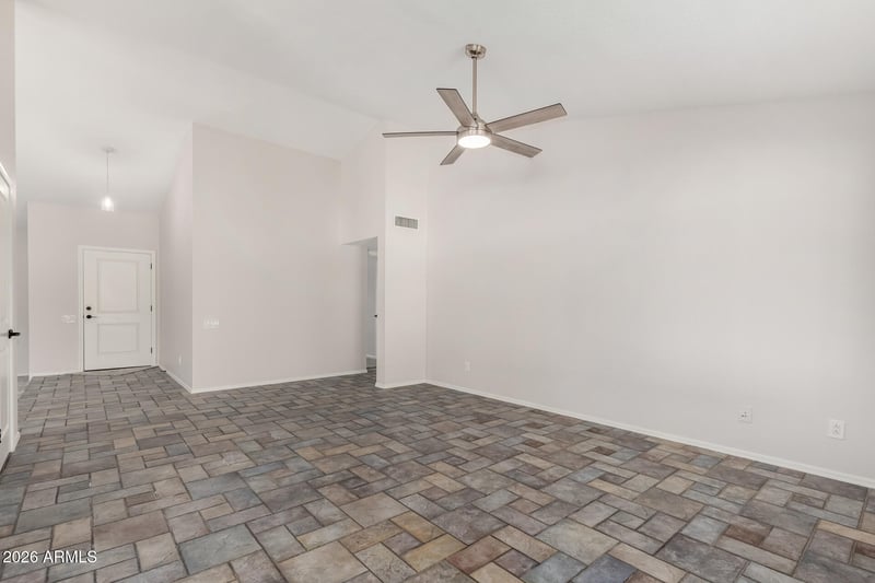 Vaulted ceilings, tiled floors, a covered patio, and a low-traffic street.