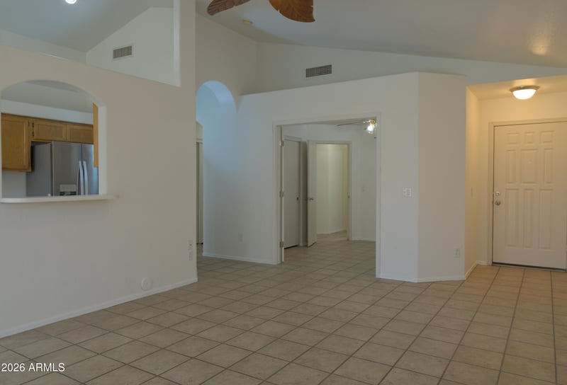 Listing details for 8338 Audrey Ln, Peoria, AZ 85382 : Charming 3 bed 2 bath home with 2-car garage in Peoria - No HOA. Move-in ready with an open-concept layout connecting the family, dining, and eat-in kitchen areas. Features include stainless steel appliances, plus included washer, dryer, and refrigerator. The primary suite offers a walk-in closet and step-in shower. Enjoy a private backyard with covered patio and high block fencing.