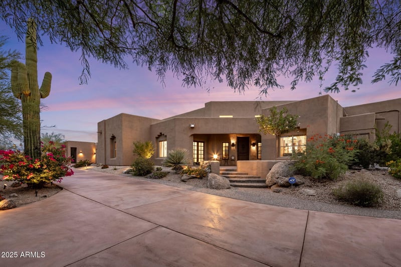 Listing details for 8400 Dixileta Dr #147, Scottsdale, AZ 85266 : This refreshed timeless custom Southwest-style home is thoughtfully positioned among the natural rock outcroppings framing the property, creating a private desert sanctuary. A long driveway leads to the residence, with a guest parking area tucked beneath the canopy of a mesquite tree and a tranquil waterfall cascading through the boulders. Inside, abundant natural light flows from transom windows, skylights, and glass doors that open from the great room into the Arizona Sun Room. Custom cherry cabinetry provides exceptional storage throughout, especially in the spacious kitchen designed for both food prep and entertaining. New quartz counters provide a generous workspace for creating and gathering, and the powder room has also been beautifully updated with new quartz counters, adding a refined touch. The open floor plan is anchored by soaring ceilings, arched passageways, Saltillo tile, and a custom fireplace with built-in niches, blending authentic Santa Fe charm with modern comforts. The attached casita offers its own garage, living room, kitchenette, bedroom and 2 private patios, while a separate entertainment wing--accessible from the 4-car garage or a private exterior entrance--boasts a game room with pool/ping pong table, entertainment area, kitchenette, half bath, and a movie room. Step outside to a true North Scottsdale retreat: a resurfaced sparkling heated pool and spa, restored ramada with rooftop view deck and fireplace, and multiple patios framed by lush landscaping and desert views. Perfectly oriented, the property captures sweeping mountain vistas and unforgettable Arizona sunsets, enhanced by outdoor surround sound for evenings under the stars. As part of Sincuidados, residents enjoy 24-hour guard-gated security, clubhouse, tennis and pickleball courts, and miles of private hiking and biking trails. Conveniently located near upscale dining, shopping, and championship golf, this estate offers the best of desert living--authentic, updated, and unforgettable.