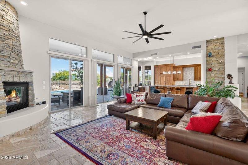 Listing details for 8540 Mcdowell Rd #117, Mesa, AZ 85207 : Highly upgraded custom home is located in the gated community of Thunder Mountain Estates in NE Mesa. The owners have completed an extensive remodel of this home with over 500k in remodeling with premium improvements. As you approach this home, the circular driveway lends ease of access and elegance to the front door. This single story, 3,254 sq ft highly upgraded custom home is located in the gated Thunder Mountain Estates. The renovation includes all-new stone travertine flooring, high end- Burdette custom cabinetry, stunning upgraded slab stone countertops, and commercial-grade appliances and plenty of storage. Thoughtful, open plan layout offfers views of the mountains and backyard are afforded in the kitchen, great room and dining areas.