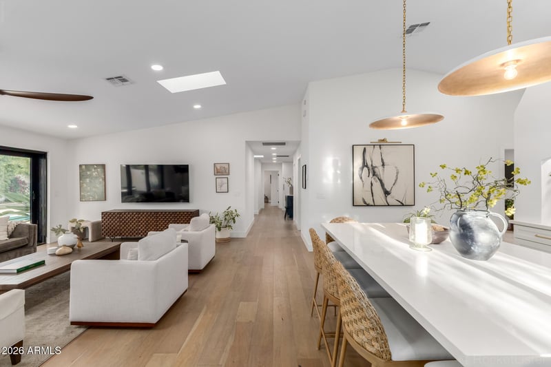 Listing details for 8600 San Daniel Dr, Scottsdale, AZ 85258 : Modern Sophistication Meets McCormick Ranch Charm with a 3 car garage, 3 full bathrooms and unbeatable walkability. This fully reimagined residence boasts an open and airy aesthetic highlighted by 16-ft cascading glass doors and seamless indoor-outdoor flow. From the white oak wood flooring to the custom made kitchen hood and working walk-in pantry, every detail has been thoughtfully designed. Escape to the outdoor oasis with a newly refinished Pebbletec pool & spacious covered patio surrounded by beautiful lush landscaping. Primary suite features new French Doors, a walk-in closet and a spa inspired bathroom. New roof w/ 10 yr warranty. Just a 10 min walk to many local favorites restaurants and a short drive to Kierland, Old Town, and world class golf- the ultimate Scottsdale lifestyle!