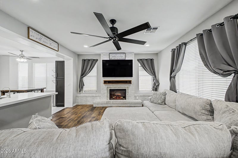 Listing details for 8636 Cinnabar Ave, Peoria, AZ 85345 : This stunning 5-bedroom home offers a 3-car garage, RV gate, and inviting front patio. Inside, enjoy soaring ceilings, wood-look flooring, and a cozy fireplace in the living room. A formal dining space is perfect for gatherings, while the updated kitchen features new stainless steel appliances, subway tile backsplash, ample cabinetry, and a breakfast bar. The spacious primary suite offers custom ship lap, a separate shower and tub, a double vanity and a walk-in closet. Upstairs, an oversized loft creates the perfect gaming or flex space. Step outside to a beautifully upgraded backyard with a brand-new pool, pergola and custom landscape lighting. Major updates include new flooring (2019), 2nd-floor AC (2023) and roof underlayment (2026). Designed for comfort and peace of mind!