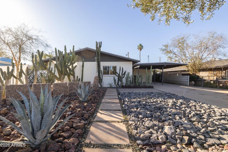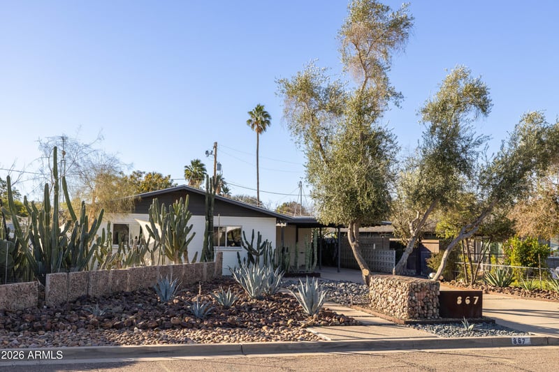 Listing details for 867 Windsor Ave, Phoenix, AZ 85006 : A Rare Architectural Gem by Luis Salazar in Historic Coronado: Discover a meticulously crafted modern sanctuary at 867 East Windsor Ave, a 4 bedroom, 3 bath home that embodies thoughtful design and artistic vision. This exceptional property sits on an expansive 8,350 square foot lot with coveted frontage facing Windsor Park (AKA Oval Park), offering serene park views and an enviable north-south exposure. This residence was owned and lovingly transformed by renowned Phoenix architect Luis Salazar, who opened Salazar Associates Architects in 1977. Over nearly five decades, Salazar established himself as a distinguished voice in Phoenix-area modern architecture, completing diverse residential, commercial, industrial, and environmental projects throughout Phoenix, and the surrounding cities. Known for his discerning eye and commitment to sustainable, energy-efficient design, Salazar brought his signature modern aesthetic and attention to detail to every aspect of this property, creating a zen-like compound that reflects both his architectural prowess and his artistic sensibilities as a photographer. The home showcases Salazar's masterful vision through countless thoughtful improvements: an oversized 400-amp electrical panel, dual-pane aluminum windows throughout, polished and stained concrete flooring, an added office with multiple work spaces, and ample natural light on the rear of the home, and solid wood panel interior doors t/o. The striking modern Lucite front door welcomes you into a space where clean lines meet warm functionality. The industrial-style architectural kitchen features stainless steel countertops and backsplash, higher-end cabinetry, a walk-in pantry, skylights, and a charming corner window. Upgraded Electrolux refrigerator, Maytag dishwasher, and a 4-burner gas range with griddle complete this chef-worthy modern space. The kitchen flow is partly open-concept into the inviting living room and formal dining space, framed by bookshelves. The thoughtful split floor plan offers two possible primary suites, each with dedicated bathrooms. The rear primary suite connects to a three-quarter bath, large double closet, and convenient interior dedicated laundry room access. Throughout the home, custom built-in shelving, solar tubes, glass tile surrounds, and birch wall details demonstrate the architect's commitment to both beauty and utility. For artists, makers, and creative professionals, this property is a dream. The expansive grounds include three distinct workshop spaces: a large finished shed with heavy-duty storage and corrugated metal roofing, a specialized darkroom with sub-panel and newer electrical designed by Salazar for his photography work, and an additional yard shed for tools and supplies. The outdoor spaces reflect Salazar's design philosophy of mindful integration with the desert landscape. Special cactus gardens featuring totem cacti, mature orchid and olive trees, an architectural accent wall, and extensive exposed aggregate concrete on both front and rear patios create visual interest from every angle. A concrete paver walkway leads you through this meditative landscape. Parking is abundant and versatile: rear-entry slab parking accessed via the alley, two additional slab spaces in front, and two covered carport spaces. Modern upgrades and features include a Rinnai tankless gas water heater, Goodman furnace and air handler, mini-split in the rear office addition, timed irrigation throughout, exterior gutter system, on-site composter, and partially upgraded sewer system. A newer roof provides peace of mind. Every detail of 867 East Windsor Avenue conveys intentionality, from the architectural interest visible at every view to the meditative quality of the spaces. This is more than a home; it's a thoughtfully curated environment that honors modern design principles while embracing the unique character of desert living. The entire property radiates the care and vision of an architect who understood that great design serves both function and soul. Experience architectural excellence in one of Phoenix's most desirable historic neighborhoods, located on one of the most special park framing blocks in all of the area. The property's prime location directly facing Windsor Park, affectionately known as Oval Park or Country Club Oval, is truly one of its most extraordinary features. Nestled between 8th and 10th Streets on Windsor Avenue, this cherished 2.5-acre elliptical public park serves as the beating heart of the NW quadrant of the Coronado Historic District, and has been bringing neighbors together since the post-war era. Surrounded by historic lamp posts and a canopy of mature shade trees, the park offers a lush, tranquil environment that provides flood irrigation to maintain its verdant beauty year-round. The park is a vibrant community gathering place where residents and visitors have enjoyed evening movies in the park, picnics, friendly soccer matches, leisurely walks along well-maintained pathways, and afternoons in the play area. It's wonderfully dog friendly and play friendly, creating a walkable, intimate atmosphere that feels surprisingly private despite being a public space. The park's unique oval design offers stunning juxtaposed views of Central Avenue's downtown high-rise buildings against the serene suburban landscape, making it a peaceful urban oasis that serves as an extension of residents' front yards and a testament to thoughtful mid-century neighborhood planning. Don't miss this home, or this special location!
