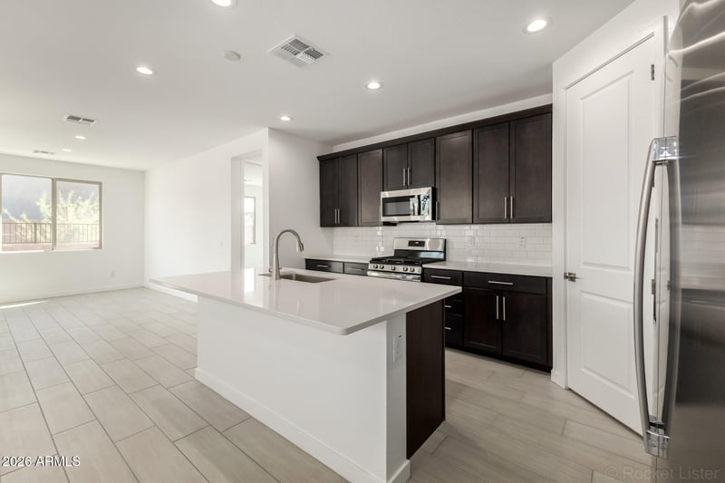 Listing details for 8713 170th Ave, Goodyear, AZ 85338 : The Azure plan is designed for modern living with stylish upgrades throughout. The gourmet kitchen boasts quartz countertops, 42'' upper cabinets, GE stainless steel appliances including a refrigerator, a walk-in pantry, and a spacious island. Enjoy 9x35 wood-look tile in main areas, 8' interior doors, a smart lock, and a tankless water heater. Additional features include a soft water loop, covered patio, garage service door, 8' garage door with opener, garage coach lights, and ceiling fan prewires in all bedrooms and the great room. This stunning home has it all!