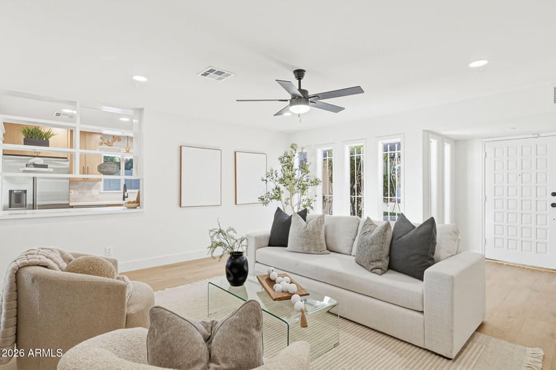 Listing details for 8770 Via De Viva --, Scottsdale, AZ 85258 : Immaculate and completely renovated 3-bedroom, 2-bath Sands Scottsdale townhome designed by renowned modern builder E.T. Wright, ideally situated in the heart of McCormick Ranch. This late mid-century modern residence blends timeless architectural character with refined craftsman influences in one of Scottsdale's most sought-after communities. The 2026 designer remodel showcases a thoughtfully reimagined kitchen featuring custom cabinetry, updated backsplash, new stainless-steel appliances, sleek countertops, and an extended pantry/laundry space within the signature view-through galley layout. Luxury hand-scraped wood flooring flows throughout, complemented by new baseboards, recessed lighting, updated plumbing and lighting fixtures, fresh interior paint, and new interior doors--creating a cohesive, elevated finish from end to end. The spacious primary suite offers a walk-in closet, dual-sink vanity, dedicated makeup vanity, and a spa-inspired walk-in shower. A desirable split-bedroom floor plan provides privacy for guests or family, and with no interior steps, the home offers comfortable single-level living. Situated on one of the largest lots in the community, the private backyard retreat features new turf, thoughtfully selected plants and trees, and refreshed landscaping. Enjoy mountain views from the expansive covered patio--perfect for relaxing or entertaining. The lush green front lawn is maintained by the community, offering beauty without the upkeep. Just moments from parks, scenic walking and biking trails, premier golf courses, dining, and shopping, this exceptional McCormick Ranch residence delivers luxury, location, and lifestyle in one refined package.