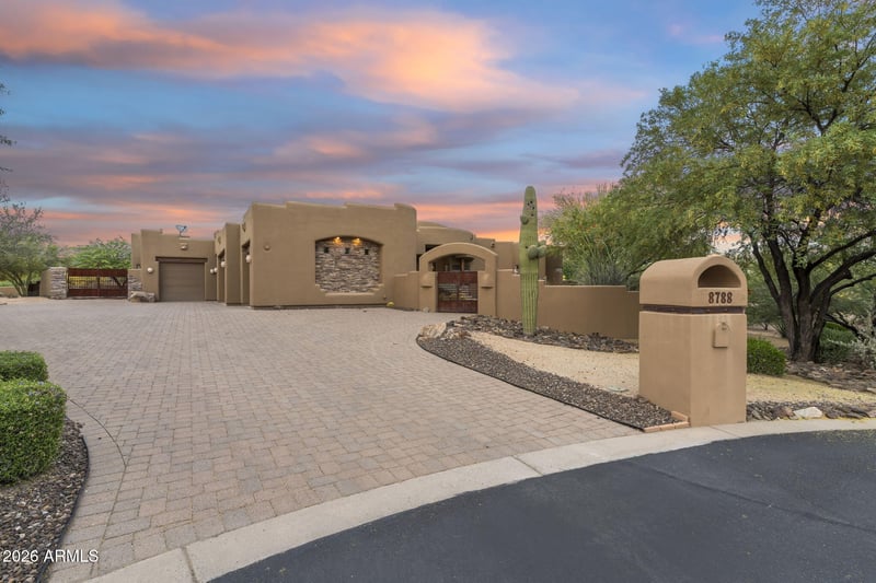 Listing details for 8788 Arroyo Seco Rd, Scottsdale, AZ 85266 : An exceptional gated residence offering refined North Scottsdale living, thoughtfully positioned to capture sweeping 360-degree views. A private courtyard entry welcomes you w/ a fireplace & inviting spaces designed for both relaxing & entertaining. Inside, the great room features a striking stone fireplace & seamless flow for gatherings. The kitchen is thoughtfully designed w/ high-end appliances, an induction cooktop, w/ a butler's pantry. The primary suite offers a peaceful retreat, while all guest bedrooms include en-suite baths. A detached casita w/ kitchenette and its own garage adds flexibility for guests. Situated on over an acre, the main home offers a three-car garage & a backyard w/ endless potential. Throughout, 24-inch travertine flooring & 8-foot alder doors. WOW! Desert Springs in North Scottsdale offers a rare blend of privacy and space, with expansive homesites set against the natural beauty of the Sonoran Desert. Just minutes from premier golf, hiking trails, and upscale dining, it delivers a peaceful, refined lifestyle without sacrificing convenience.
