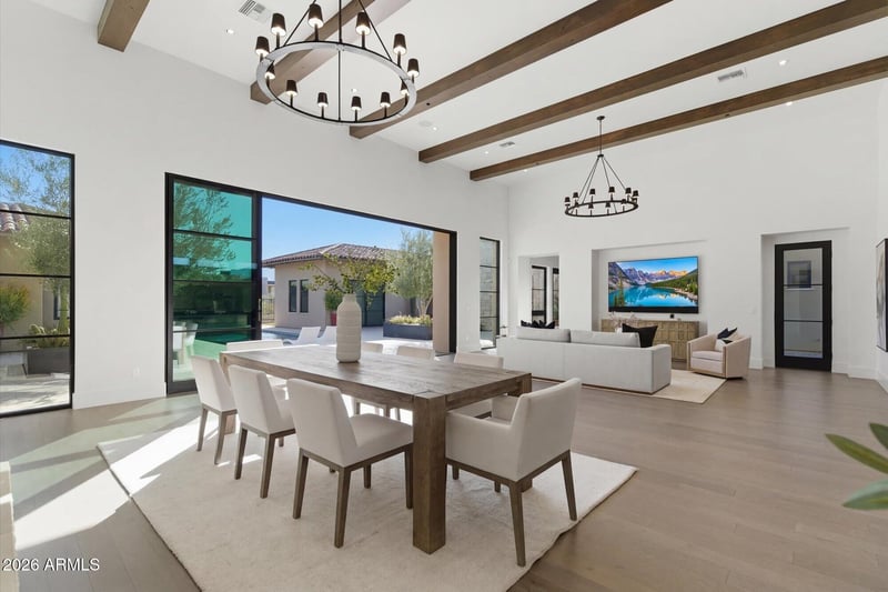 Spanning approximately 6,285 square feet on a 37,745 square foot homesite, this single-level residence was designed to embrace seamless indoor-outdoor living. Expansive sliding glass walls connect the great room and second living space to a beautiful backyard and oversized covered patio, framing the mountain views and creating an effortless flow for entertaining. Rich wood flooring, custom designer lighting, quartz surfaces, and tailored cabinetry elevate the home's refined aesthetic, while a dramatic fireplace adds warmth and elegance to the main living space.