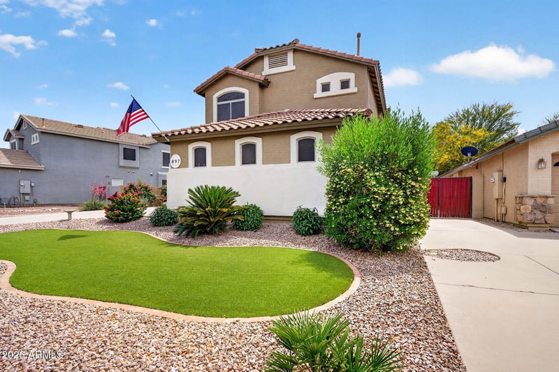 Listing details for 897 Holstein Trl, San Tan Valley, AZ 85143 : Welcome to this beautifully maintained 2 story home in Circle Cross Ranch in San Tan Valley, showcasing true pride of ownership throughout. This spacious residence features 5 bedrooms plus a versatile loft, offering flexible living space perfect for a home office, playroom, media area, or additional lounge. The well designed floor plan provides comfortable living with generous room sizes and plenty of natural light. The 3-car garage offers ample space for vehicles, storage, or hobbies. Step outside to an amazing backyard retreat featuring lush, mature landscaping, creating a peaceful and private outdoor setting. Enjoy Arizona evenings under the pergola with a cozy outdoor fireplace, perfect for entertaining, relaxing, or gathering with friends and family. Located in the desirable Circle Cross Ranch community, this home offers a great combination of space, functionality, and outdoor living, close to parks, schools, and everyday conveniences. A wonderful opportunity to own a thoughtfully cared-for home in a popular neighborhood.