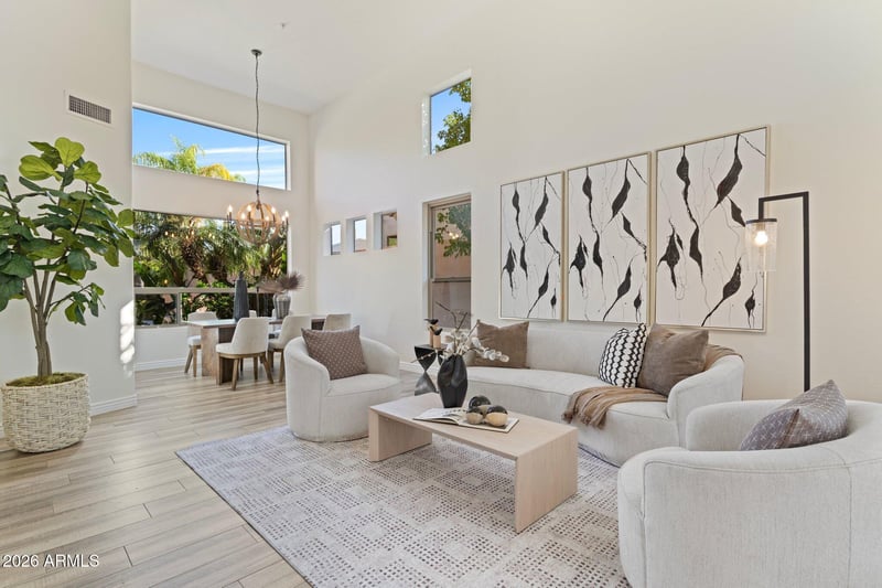 Listing details for 9058 Casitas Del Rio Dr, Scottsdale, AZ 85255 : Positioned in the sought-after Canada Ridge community of North Scottsdale, this beautifully updated two-story home delivers the light, space, and livability that discerning buyers search years to find. Soaring ceilings and oversized windows flood every room with natural light and frame stunning mountain views that set this home apart from the moment you walk in. Spanning 2,571 square feet, this 3-bedroom plus office, 2.5-bath residence offers a fully remodeled kitchen with white custom cabinetry, quartz countertops, and stainless appliances opening to a casual dining space with sweeping outdoor views. The great room connects seamlessly to the backyard through a wall of glass, and a separate wet bar adds an entertaining dimension rarely found at this size. The primary suite upstairs is a true retreat. Mountain views, a freestanding soaking tub, oversized glass-enclosed walk-in shower with dual rain heads, dual vanities with quartz counters, custom cabinetry, and a walk-in closet behind sleek mirrored sliding doors. The backyard delivers. Private pool and spa, artificial turf lawn, covered patio, outdoor fireplace, and a built-in BBQ -- all within a mature, privately landscaped lot. The three-car garage is a genuine differentiator. Most homes on this floor plan converted the third bay into a bedroom, creating an awkward layout. This one kept it. Floor-to-ceiling built-in cabinetry and overhead storage racks complete the package. The home has been systematically maintained. Full kitchen and flooring remodel in 2018. Full bath remodel and new roof in 2019. Both AC units replaced in 2021 and 2025. New furnace and water heater in 2025. Fresh interior paint in 2026. Buy with confidence. Minutes from Pima and Pinnacle Peak, AJs, Mastros, The Little Snitch Coffee Shop, world-class hiking and biking, DC Ranch Marketplace, and Loop 101. Close enough to everything. Far enough from the noise.