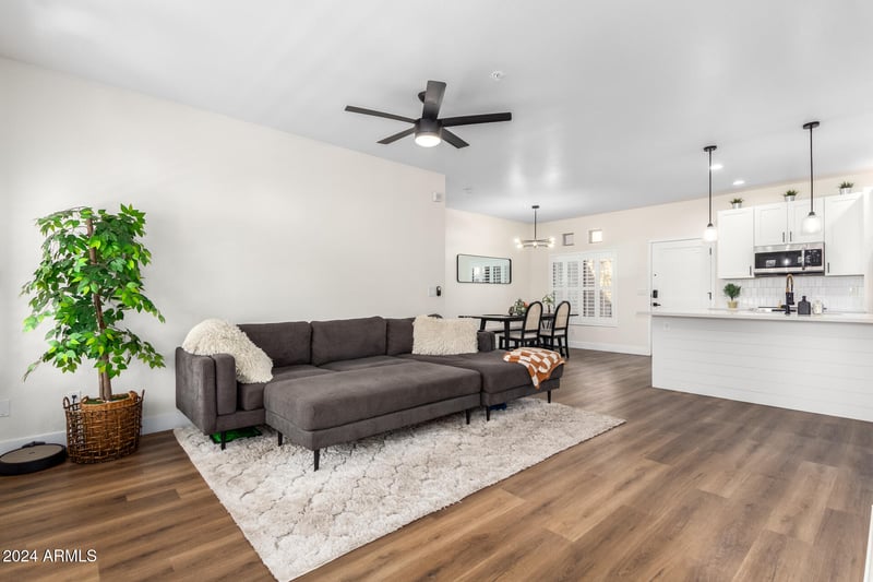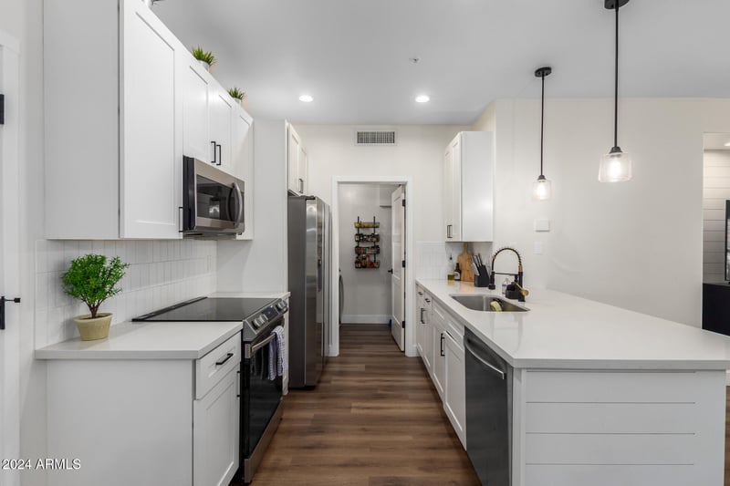 Listing details for 9100 Raintree Dr #144, Scottsdale, AZ 85260 : Welcome to this beautifully remodeled 2-bedroom, 2-bath condo in the serene, resort-style community of Raintree Casitas. LOCATION ,LOCATION, LOCATION- Minutes away from Scottsdale's most iconic attractions- PHX OPEN & Barrett Jackson! Surrounded by lush greenery, towering palm trees, and stunning mountain views, located in the heart of Scottsdale! Upon entering, you'll be welcomed by a bright & airy open-concept floor plan, featuring a spacious split layout ideal for both relaxation and entertaining. The kitchen showcases sleek 42'' soft-close white shaker cabinets, luxurious quartz countertops, and a 30'' single-basin stainless steel sink. The subway tile backsplash, large peninsula island with pendant lighting, Samsung stainless steel appliances complete this modern and functional space The living area is equally impressive with a striking shiplap accent wall, abundant natural light, and custom plantation shutters throughout, adding a touch of luxury to every room. Both the guest bathroom and the master ensuite have been fully updated with new vanities, quartz countertops, mirrors, light fixtures, and more, bringing a fresh, contemporary feel to every detail. Whether you're unwinding on the private patio or enjoying the vibrant desert landscape, this condo offers a truly exceptional living experience. Easy Lock & Go experience for those that desire enjoying Arizona's best times of the year!