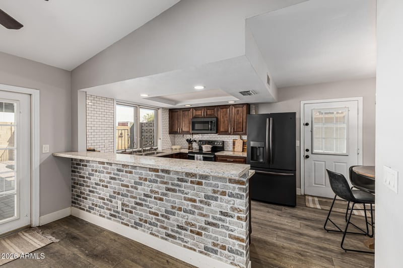 Updated kitchen with cool exposed brick look on outside of breakfast bar, granite counter tops, tons of cabinet and storage space and newer stainless steel smudge proof appliances!! (2018)