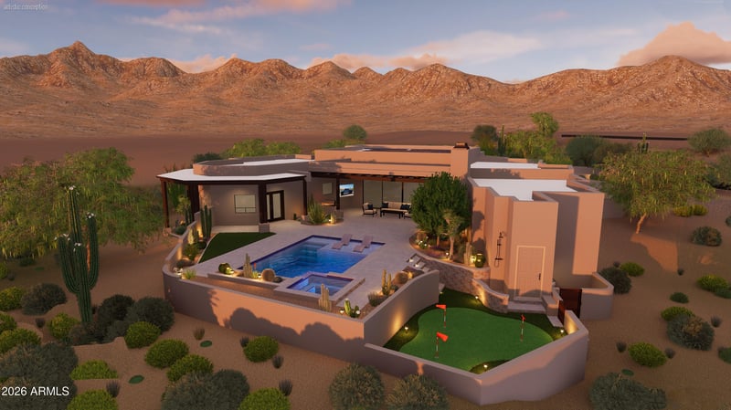 Listing details for 9197 Bajada Rd, Scottsdale, AZ 85262 : Recently refreshed with interior paint, modern plank flooring in guest suites and the office. Outdoor remodel in process, completion mid-summer. New swimming pool and spa currently being installed - see photos, landscape refresh and more. This exceptional single-level custom home, updated by renowned builder Dick Lloyd, blends timeless Southwest architecture with a beautifully modernized interior for the perfect balance of character and comfort. Ideally located on a serene cul-de-sac, the home is designed with a split floor plan for privacy and functionality, with the spacious primary suite set apart from three ensuite guest bedrooms and dedicated office. From multiple vantage points, enjoy breathtaking mountain and sunset vistas, glimpses of the golf course, and the twinkling city lights beyond. Perfect for both personal enjoyment and grand-scale entertaining, with an open floor plan, this home features expansive indoor and outdoor spaces that flow seamlessly together. The property boasts a private putting green, an owned whole-home dedicated solar system with a 400-amp panel, a 10 kV system, and 28 kW Tesla battery storage, all controllable via phone app for ultimate convenience and energy management. Up-to-date warranties cover essential components, including the Roof, HVAC system, water main, refrigerator, Kinetico water system, and more. A climate-controlled 3-car garage, home automation, and exceptional outdoor living spaces elevate the home's lifestyle appeal.