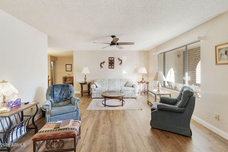 Listing details for 922 79th Way, Mesa, AZ 85208 : A beautifully maintained single‑level home in the highly desirable, gated 55+ community of Fountain of the Sun, Welcome to this inviting 2‑bed, 2‑bath residence featuring an open, functional layout and thoughtful upgrades throughout. The home offers 1,554 sq ft of living space with a bright, comfortable interior and a floorplan designed for easy living. The upgraded kitchen cabinetry adds warmth and style, while the split‑bedroom layout provides privacy for guests. A standout feature is the large finished AZ room, perfect as a hobby space, office, fitness area, or second living room. Step outside to enjoy Screened in Patio and a low‑maintenance lot. 2‑car garage with Built-In Storage Cabinets, Roof (2018) Heat Pump (2022)