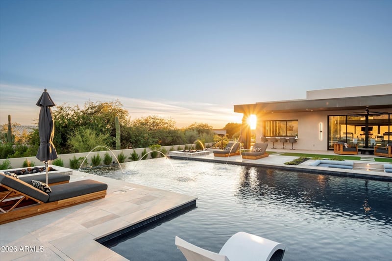 Listing details for 9245 Rimrock Dr, Scottsdale, AZ 85255 : An estate defined by intention, scale, and warmth. Arrival is nothing short of dramatic. A circular driveway guides you either to the private 8-car auto court or toward the main entrance, where floating steps glide over water, leading to twin fountains, centered between them, a striking floating fire feature sets an unforgettable tone before you even step inside.