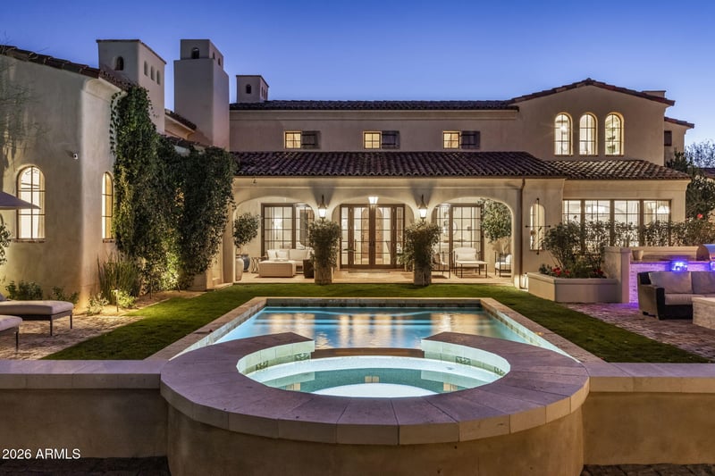 Listing details for 9290 Thompson Peak Pw #455, Scottsdale, AZ 85255 : Situated on a 1.07-acre lot within the Country Club at DC Ranch neighborhood, this Spanish-inspired custom home blends timeless, classic design with modern, high-end touches. Accented with hand-made roof tiles, and rustic tile and brick patios, the exterior of the home is surrounded by graceful, mature landscaping creating a private and tranquil setting, while multiple courtyards, patios, and garden spaces encourage a seamless connection between interior and exterior living. Inside, reclaimed wood flooring and vaulted beamed ceilings establish a sense of enduring craftmanship while artisanal tiles, textured finishes and curated light fixtures add depth and character to the living spaces. The kitchen is a case study in form meets function - a neutral color palette, custom arched cabinets, Quartzite countertops, and a patterned tile backsplash create a warm and refined aesthetic, while premium Wolf and SubZero appliances including a 6-burner cooktop with griddle, double gas ovens, a steam oven, separate refrigerator and freezer and a Scotsman icemaker enhance functionality and flow. The windowed dining area overlooks the backyard and is perfect for both casual and formal dining, while a butler's pantry provides additional prep space and includes a built-in wine fridge, beverage drawers, microwave, and added storage. The kitchen opens naturally to the primary living area, which is anchored at one end by a floor to ceiling fireplace and offers access to the back patio. The main level includes the primary suite and two ensuite guest bedrooms, one of which is currently being used as a den. Upstairs, the layout is intentionally limited to an additional guest bedroom, bathroom and an office that overlooks the primary living space below. The primary suite is a refined retreat with a quaint fireplace, custom window coverings, and direct access to the backyard and outdoor living spaces. The ensuite bath, elegantly refreshed in 2024, offers dual vanities, a free-standing soaking tub, tiled shower, a custom closet, and natural light from an arched window that overlooks a small, enclosed courtyard with custom tile detail. The backyard continues the home's architectural character with a cozy covered patio with tiled fireplace, a European style pool with water features and a raised spillover spa, Saltillo tile and brick patios and decking, an outdoor kitchen with built in barbeque and side burner, large covered dining ramada, an elevated covered deck, grassy lawns, and lush, resort-style landscaping professionally designed and recently refreshed. Approved plans exist for a 680-sf guest house. The heavy lifting has been done for you with 3 HVAC systems replaced in the last couple of years. Throughout this residence, craftsmanship and attention to detail are evident in each warm and welcoming space. From custom cabinetry and premium materials to distinctive tile treatments and architectural elements, the home balances classic elegance with modern luxury and refined indoor/outdoor living. Some furnishings are available by separate bill of sale, offering the opportunity for a turnkey transition if desired.