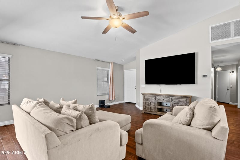 Listing details for 9319 Harmony Ln, Peoria, AZ 85382 : This beautifully updated, single level home is the perfect move for those ready to simplify without sacrificing style or for anyone seeking a high quality home under $450,000. Offering a rare 4 bedroom, 2 bathroom residence in one of the Valley's most strategic corridors, this property is designed for the savvy buyer who values both financial stability and a life full of adventure. The home welcomes you with a spacious, layout that prioritizes easy maintenance with tile in all traffic areas, while the kitchen shines with granite counters and white cabs and an island! The bedrooms feature new carpet and custom feature walls. The main living areas showcase vaulted ceilings and that open space feel, highlighted by the additional dining room door for added indoor/outdoor living enjoyment. Practical upgrades offer peace of mind, including an AC that is only 10 years old and a newer variable speed pool pump. While updated a few years ago, the home retains a charming, lived-in character that feels immediately like home. The backyard has been thoughtfully transformed into a private escape where you can enjoy the Arizona sun beside the sparkling pool, which is safely fenced and surrounded by premium travertine tile. The addition of high-quality turf provides a pop of green year-round without the upkeep, and the expansive side yard includes an RV gate with pavers, perfect for storing your outdoor gear. This location is a true destination, placing outdoor enthusiasts minutes away from world class hiking at nearby preserves and just a short drive from boating at Lake Pleasant. For the professional, the proximity to the new TSMC campus and major freeways makes for an effortless commute, while the dining and nightlife of the area remain right around the corner. This home offers a move-in ready feel with the opportunity to add your own personal touches over time. Don't miss your chance to put down roots in an up and coming area where the lifestyle is as big as the investment potential.