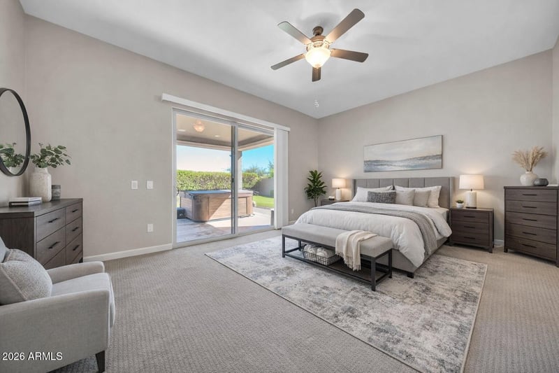 Step outside to a truly exceptional backyard oasis - designed for year-round Arizona living. With no rear neighbors, privacy and ambiance take center stage. Enjoy travertine and paver hardscaping, an extended patio with built-in surround sound, a built-in BBQ with refrigerator, fire pit, tranquil water features, custom putting green with chipping zones, hot tub, and mature citrus trees including lemon, tangelo, and grapefruit. Lush privacy hedges, colorful landscaping, and accent lighting complete this entertainer's dream.
