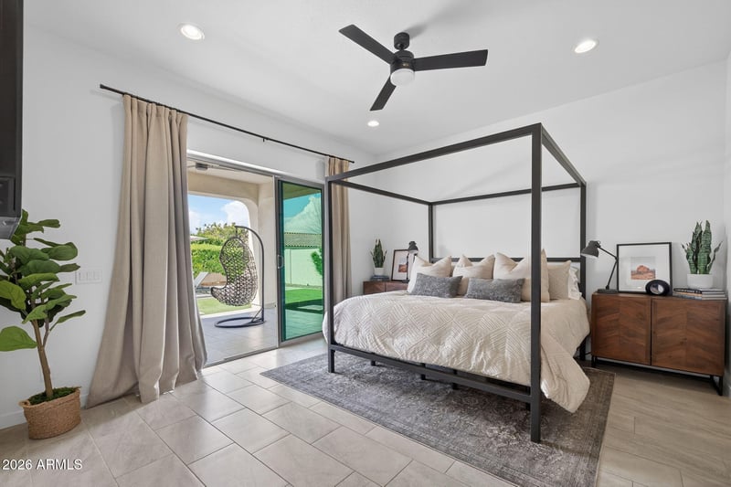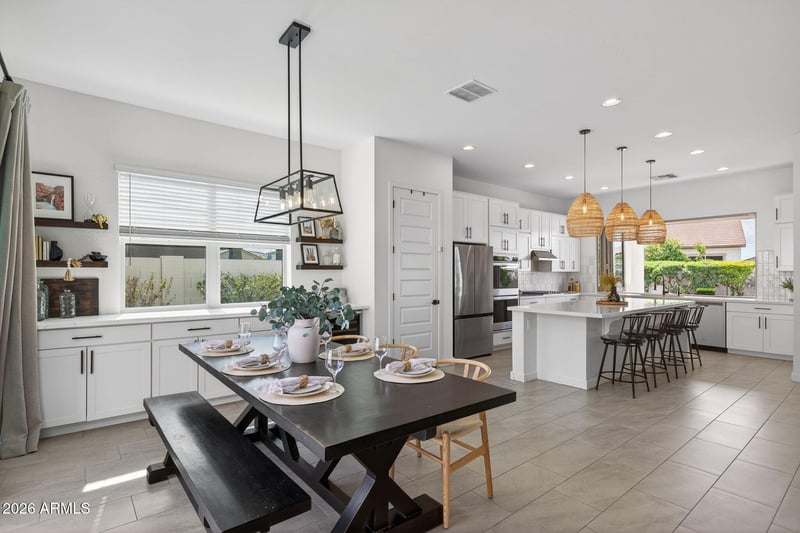 Listing details for 9517 Tungsten Dr, Mesa, AZ 85212 : Welcome to your slice of paradise in one of Eastmark's most exclusive gated enclaves. Beautiful curb appeal greets you with artificial turf, a paver driveway and walkway, and landscape lighting that elevates the exterior from the start. Step inside and you are immediately drawn to the openness and natural light. Just beyond the entry, a private interior courtyard creates a peaceful focal point in the heart of the home. Full wall sliders in the dining room and living room blend indoor and outdoor living while showcasing the incredible backyard. The living room also features surround sound and stunning views of your personal oasis. The gourmet kitchen is designed for entertaining with double ovens, double stacked white cabinetry with modern black hardware, quartz countertops, a single apron sink, tile backsplash, reverse osmosis system, designer pendant lighting, and a sliding window to the patio. Extended cabinetry in the dining area with a built-in beverage fridge adds even more functionality. The spacious primary suite offers canned lighting, no carpet, and its own private slider leading directly to the backyard. The bathroom impresses with a custom black barn door with full mirror, separate tub and shower with a rainfall head, dual vanities with a sitting area, and custom closet built-ins. Secondary bedrooms feature brand new berber carpet, and the third bedroom has no carpet for added flexibility. The laundry room includes upper and lower cabinetry with a butcher block countertop. Outside, the oversized lot transforms into a true resort. The extended patio features zero transition matching interior tile, surround sound, and a high capacity misting system with the capability to cool the entire backyard including the side yard and turf. The heated and chilled pool features a large baja step, in floor cleaning, and beautiful water features. Living in Eastmark means enjoying resort style amenities including pools, splash pads, parks, Steadfast Farm, and the community clubhouse known as The Mark. Come see it for yourself and make this home yours.