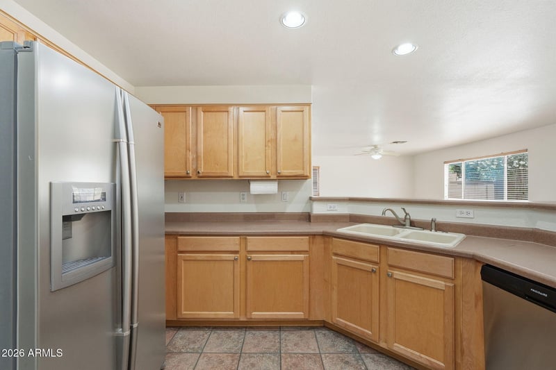 Listing details for 9729 Jan Ave, Mesa, AZ 85209 : Beautifully maintained 3 bed, 2 bath home offering 2,036 sq ft of comfortable living. Bright, open layout with vaulted ceilings, neutral tones, and abundant natural light. Spacious kitchen features recessed lighting, breakfast bar, stainless steel/white appliances, and ample cabinet/counter space, opening to a large living area--perfect for entertaining. Primary suite includes walk-in closet, full bath, separate tub, and step-in shower. Enjoy a private backyard with covered patio. Great curb appeal with 2-car garage and well-kept landscaping. Located just three homes from community pool, spa, park, playground, tennis and basketball courts, with quick freeway access.