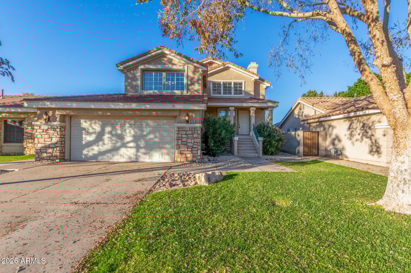 Listing details for 976 Hudson Way, Gilbert, AZ 85233 : Introducing this tastefully appointed multi-story home featuring 3 bedrooms, 2.5 baths, a living room + a family room, a 2-car garage and stone facade! Freshly painted interior showcases vaulted ceilings, soft palette, abundant natural light, wood-look flooring, and ceiling fans. Inviting open floor plan centers around a cozy fireplace, creating the perfect setting to relax on cool evenings. Airy kitchen comes with plenty of cabinet space, recessed lighting, hanging pot rack, stainless steel appliances, and French doors leading to the balcony. In the large main bedroom, you will find a private bathroom with a shower & tub combo and a walk-in closet. Formal family room on the lower level is excellent for entertaining. Serene backyard has a covered patio where you can sit and unwind after a busy day. Don't let this turn-key beauty slip