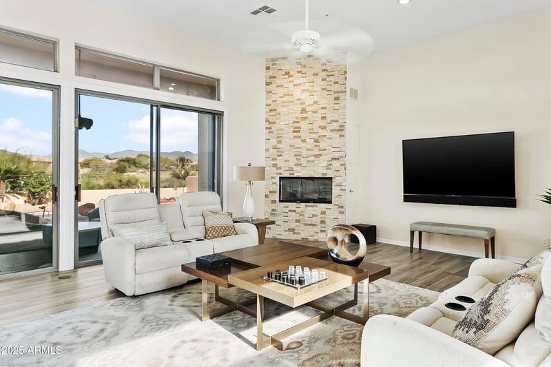 Listing details for 9876 Preserve Way, Scottsdale, AZ 85262 : Located within the prestigious, gated Legend Trail Golf community of North Scottsdale, this beautiful residence, set on the 13th fairway, showcases the highly desirable Star Chaser floor plan with 3 bedrooms and 3.5 bathrooms, including a sought-after attached casita with private entrance from the inviting courtyard—ideal for guests or a private office. Wonderfully cared for, the home features fresh interior paint, updated tile plank flooring and bedroom carpet in the main quarters, and a new primary HVAC system installed in 2023. The remodeled kitchen anchors the open-concept layout, seamlessly connecting the kitchen, dining, and great room, with a den thoughtfully integrated into the main living space to enhance versatility. Soaring 12' ceilings, a striking floor to ceiling custom stone fireplace, and dual sliding glass doors fill the home with natural light while capturing picturesque mountain and golf course views. The spacious Owner's Suite serves as a peaceful retreat with direct access to the backyard and an exquisitely remodeled bathroom with spa style walk-in shower. Outdoor living shines in the marvelous backyard, complete with an expansive covered patio, refreshing pool with rock waterfall, built-in outdoor kitchen, and an inviting fire pit creating a warm, intimate gathering space for enjoying serene desert sunsets. Legend Trail residents enjoy championship golf, tennis and pickleball, a fitness and community center, scenic trails, and on-site dining, all within one of North Scottsdale's most desirable gated communities.