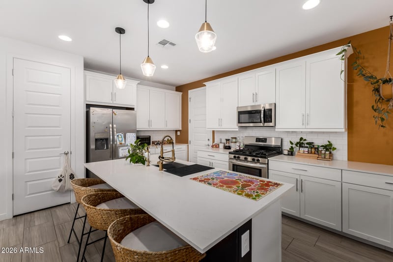Listing details for 9916 Texas Ave, Mesa, AZ 85212 : Welcome to 9916 E Texas Ave in Mesa, Arizona, located in the highly desirable master-planned community of Cadence at Gateway. Built in 2022 by Lennar, this Energy Star Certified home offers 4 bedrooms, 3 full bathrooms, 2,248 square feet of thoughtfully designed living space, and the added peace of mind of a 10-year, transferrable structural warranty. If you have been touring brand-new construction in Mesa but want upgraded finishes, a completed backyard, and immediate move-in availability without the builder timeline, this home delivers exceptional value. The open-concept main level is optimally designed for real family living and effortless entertaining. Natural light fills the spacious great room, flowing seamlessly into a beautifully upgraded kitchen featuring extended white shaker cabinetry, quartz countertops, a massive center island with breakfast bar seating, stainless steel appliances, and gas range cooking. The additional cabinetry provides storage that exceeds many builder base packages, making everyday organization simple and functional.